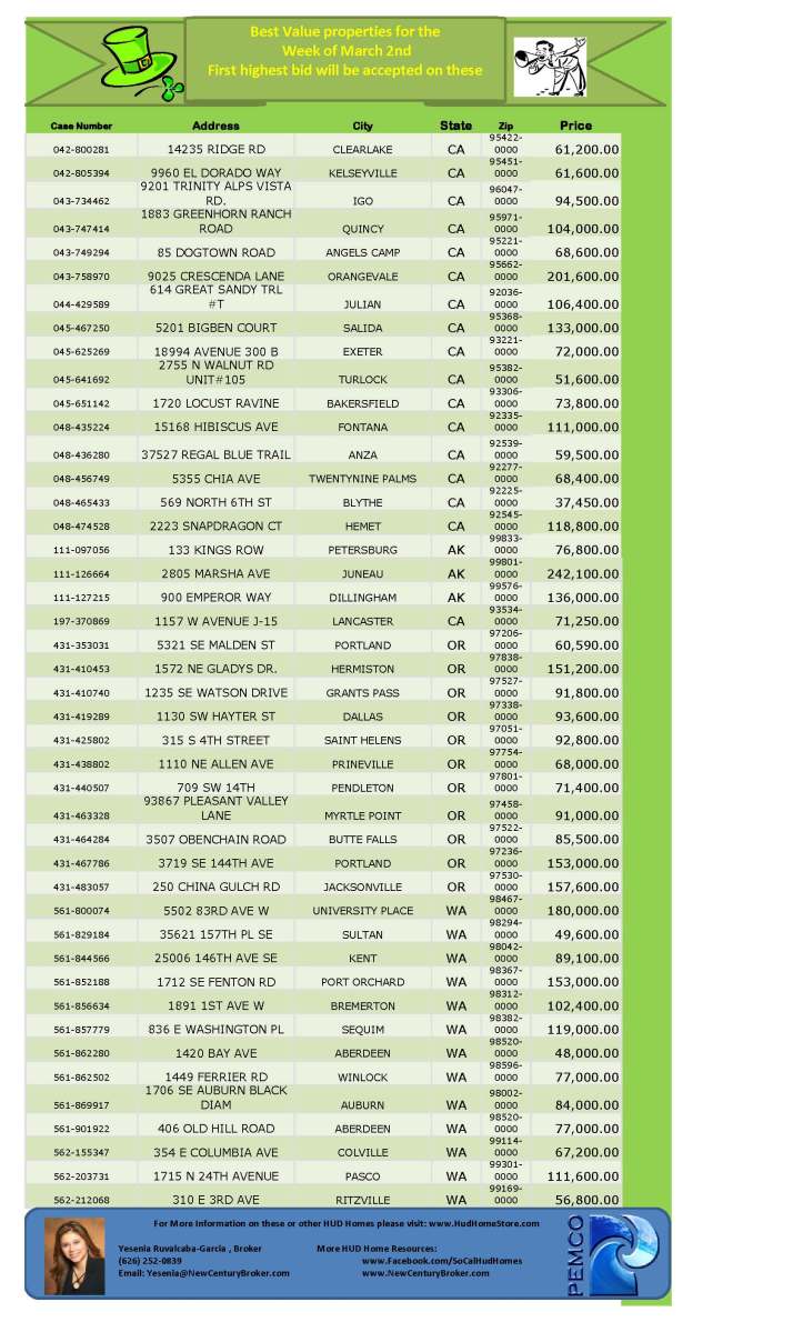 Here is this week’s Best Value List! As you can see there are several California Homes! Please feel free to contact me should you have any questions regarding these homes. You can also view other available HUD homes on www.HUDHomeStore.com.