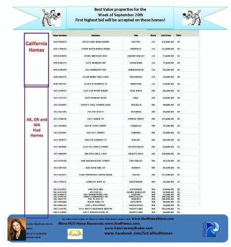 September 25, 2012 Yesenia Ruvalcaba-Garcia HUD Best Value List for the week of September 20th 2012 Click to Enlarge Discover more from New Century Broker's Blog Subscribe to get the latest posts sent to your email. Type your email… Subscribe Share this: Click to share on X (Opens in new window) X Click to share on Facebook (Opens in new window) Facebook Click to email a link to a friend (Opens in new window) Email Click to share on LinkedIn (Opens in new window) LinkedIn Click to share on Pinterest (Opens in new window) Pinterest Click to share on Reddit (Opens in new window) Reddit Click to share on Tumblr (Opens in new window) Tumblr Click to print (Opens in new window) Print Like Loading... Related