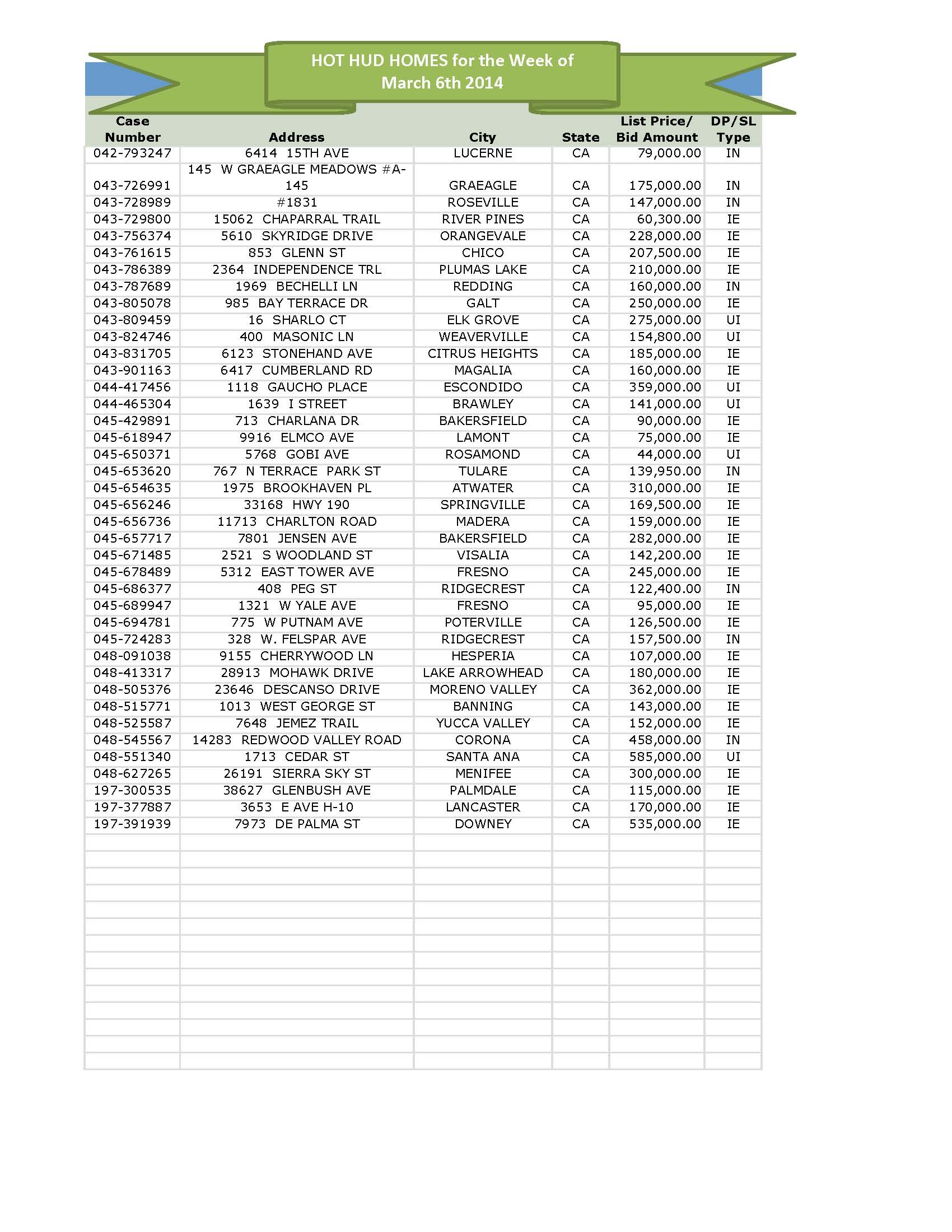 Here is this week’s list of California HUD Homes passed on to us by Pemco. These homes are currently available and ready for your bids ASAP! As always, give me a call to submit your offers.