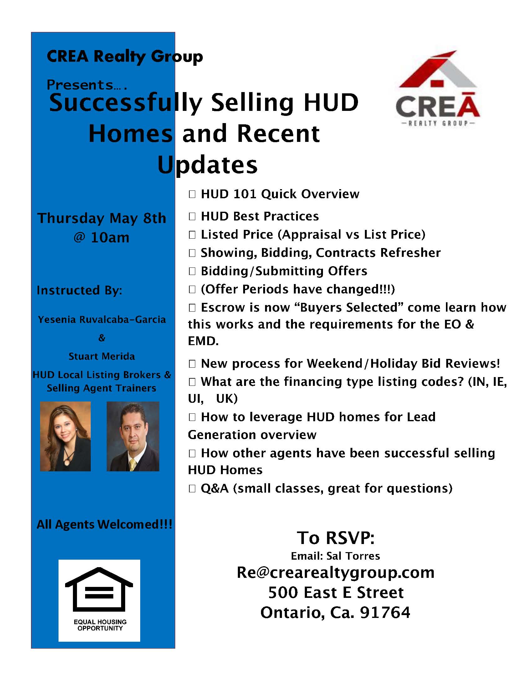 Join us TOMORROW May 8th: HUD Class from 10am-12pm. Jam packed class on HUD basics, HUD Web site search tool, BLB’s resource site, lead generation, contracts, escrow process and marketing examples for leveraging HUD listings for Buyer AND seller leads. RSVP today, seating is limited!