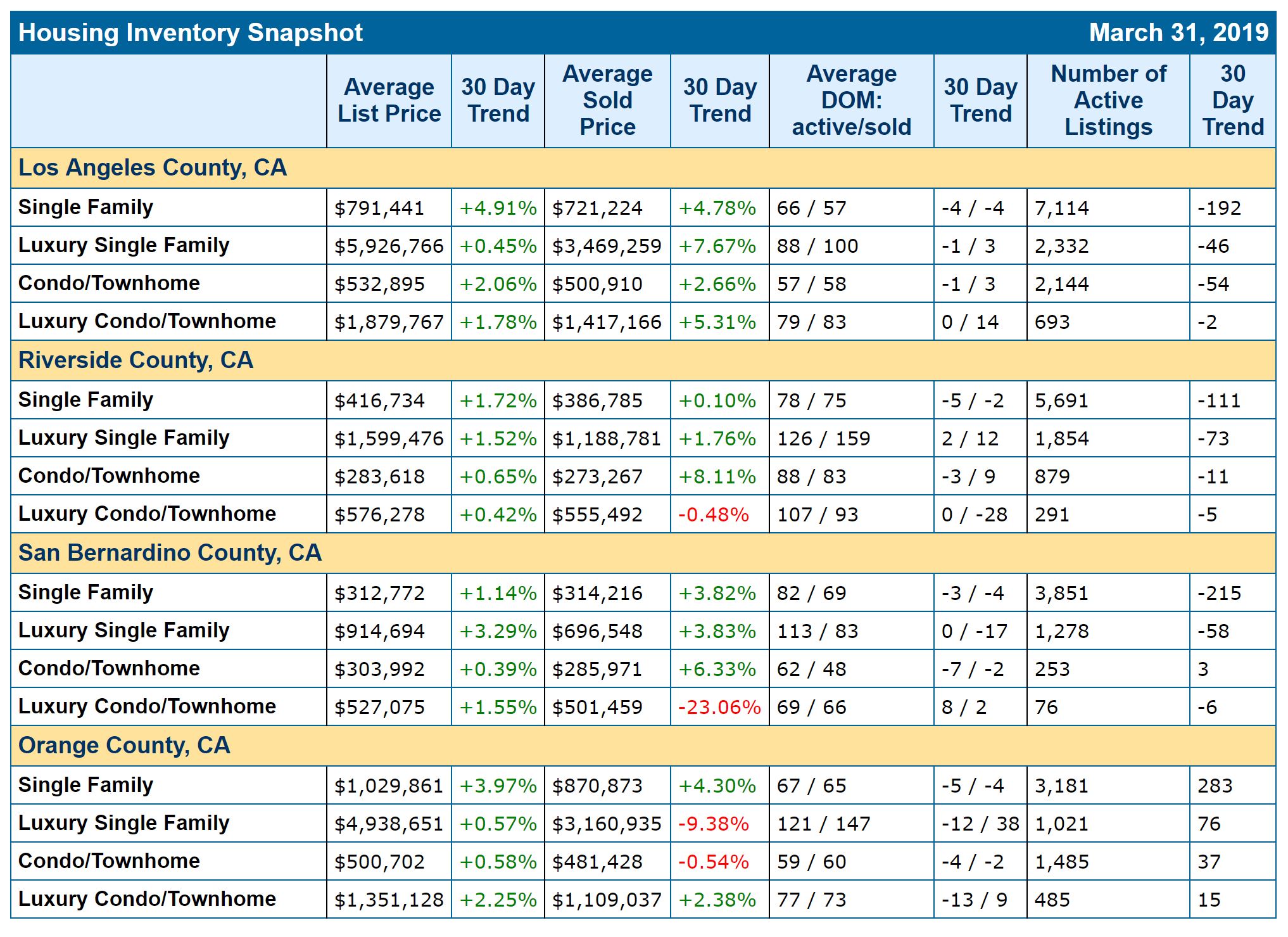 We are officially in the middle of the Spring Selling Season and boy do the numbers show it! The average sold price of homes in Los Angeles County have gone up almost 5% in the last 30 days! We are also seeing that homes are spending less time on the market and the availability of active inventory is down.