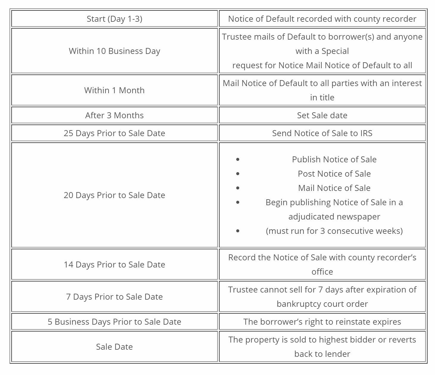 The timeline displayed here is typical in a California non-judicial foreclosure. The foreclosure timeline does not begin until the lender feels they have exhausted all avenues for curing the payment delinquency.