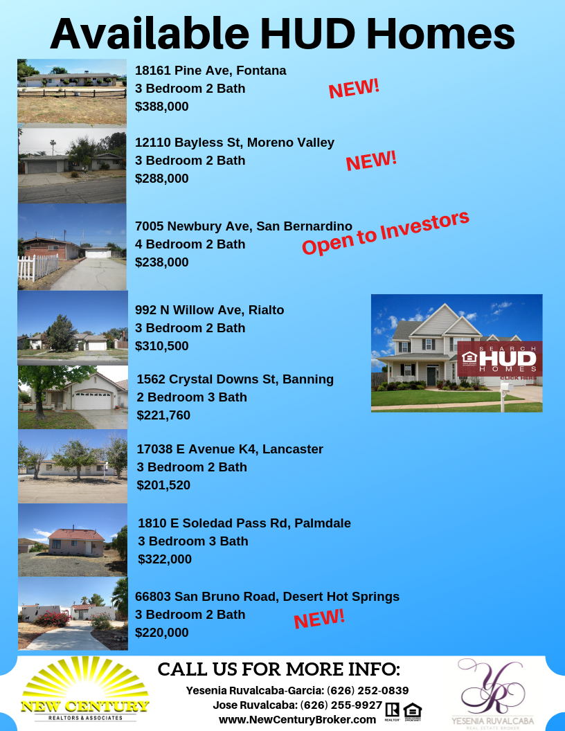 Here is this weekend’s list of new available HUD homes throughout Los Angeles, San Bernardino, and Riverside Counties! We are seeing an uptick in the amount of HUD homes that are hitting the market, homes are being released almost daily so make sure you check back often so that you don’t miss out on the deal that is perfect for you!