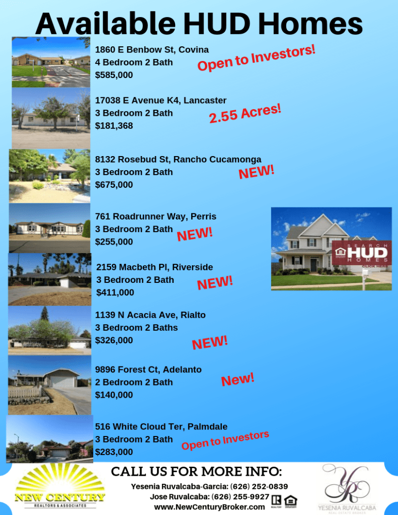 Here is this weekend’s list of new available HUD homes throughout Los Angeles, San Bernardino, and Riverside Counties! We are seeing an uptick in the amount of HUD homes that are hitting the market, homes are being released almost daily so make sure you check back often so that you don’t miss out on the deal that is perfect for you!