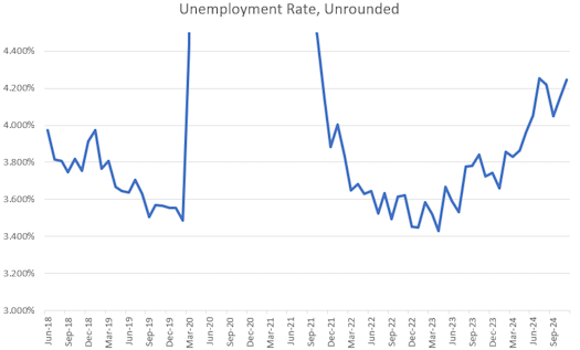 It would be fair to point out that 4.2+ is still a historically low unemployment rate, but just as fair to point out that the unemployment rate tends to move with a sort of glacial momentum that rarely changes course abruptly.